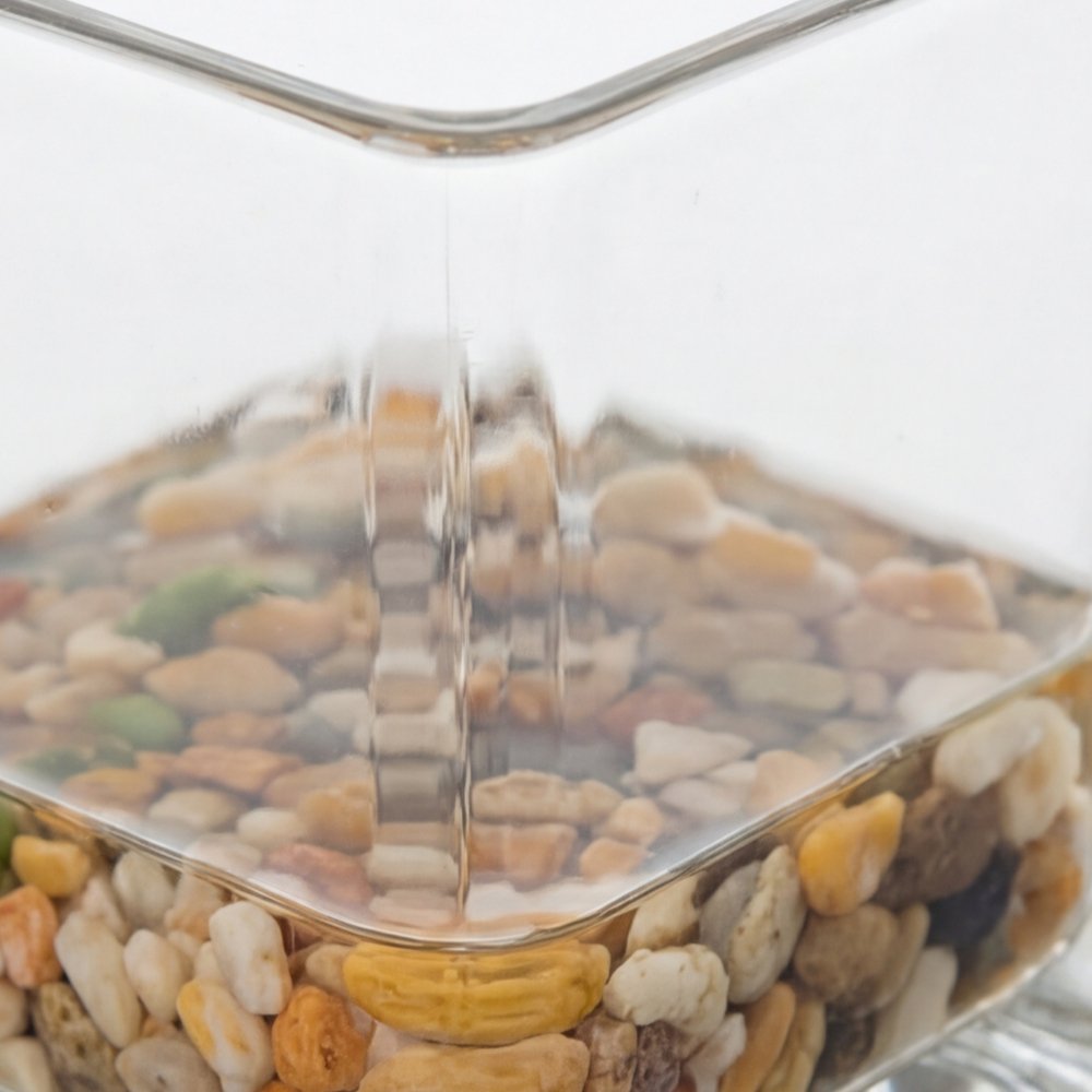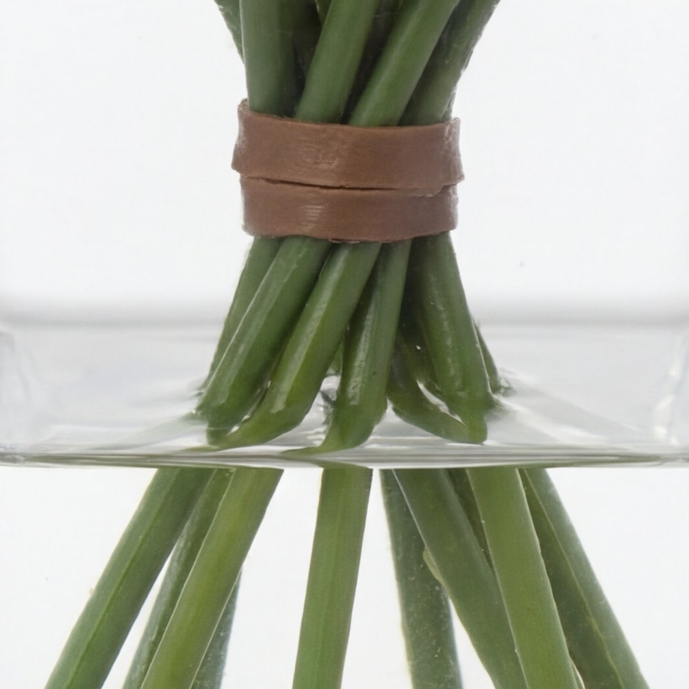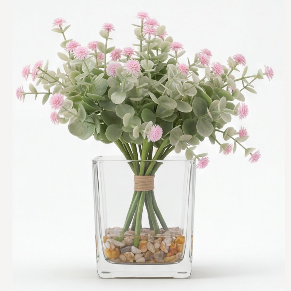 - Diseño Único y Sofisticado: Un ramo artificial de nube rosa, sujeto con resina transparente sobre piedras de río, contenido en un elegante florero de cristal cuadrado. Un conjunto que combina modernidad y un realismo sorprendente.