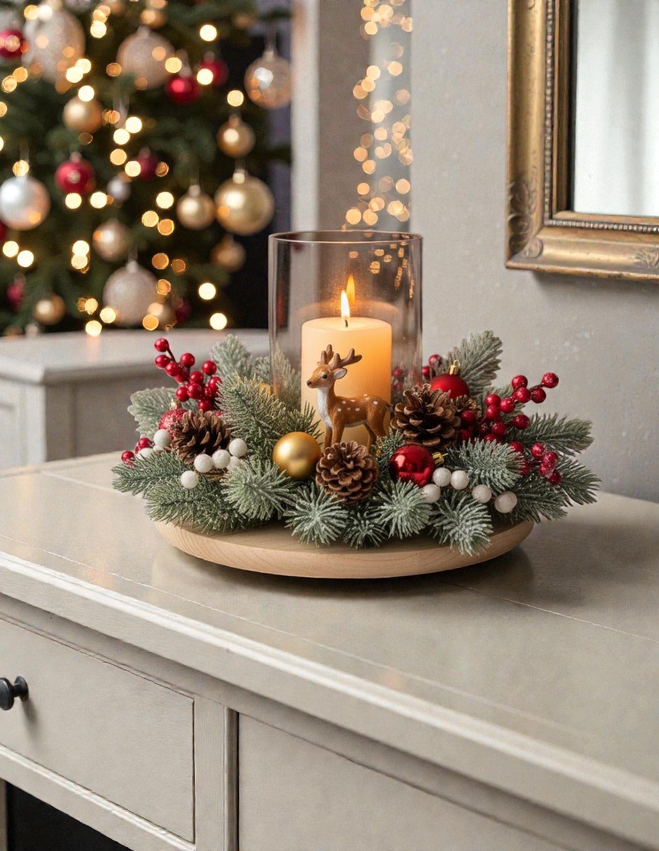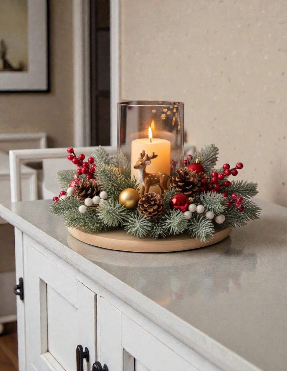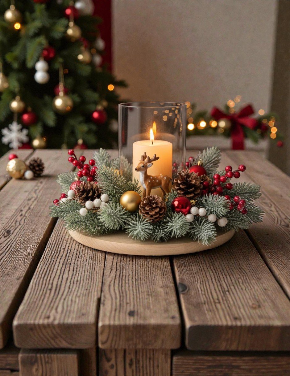 🕯️ Material: Madera clara, cristal, pino artificial, bayas y figura de reno.