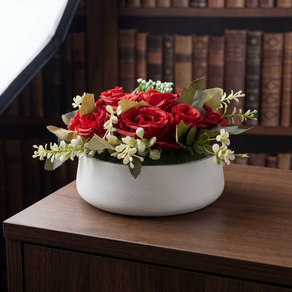 Este diseño meticulosamente elaborado combina la belleza clÔsica de las rosas con la durabilidad de materiales de alta calidad, como tela y producto sintético, en una base tipo cuenco de concreto/yeso. Garantiza un aspecto fresco y vibrante durante todo el año, evocando la pasión y calidez de un ramo natural pero con la practicidad de lo artificial.